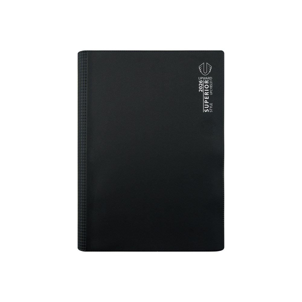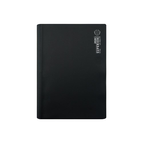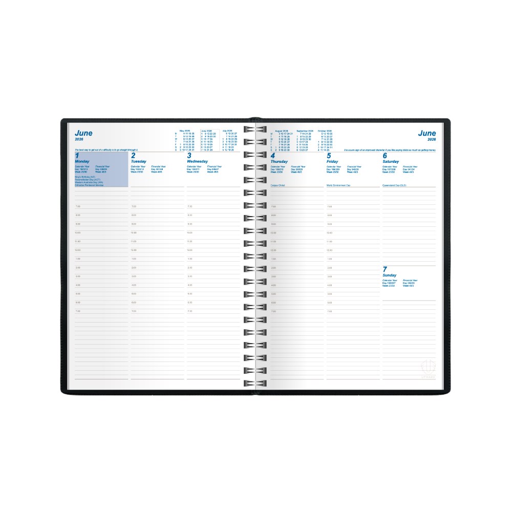Featuring a padded, phthalate free, PVC cover, pockets for storing business cards and wire-o binding to allow the diary to lie completely flat when open.