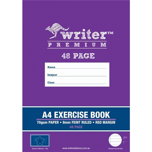 Writer Premium Exercise Books feature heavy duty covers, high quality white 70gsm paper with blue ruled lines and a red margin